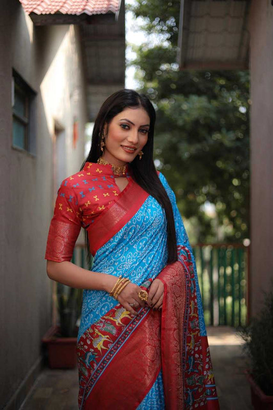 Stylish Dola Silk Saree with All Over Bandhej & Kalamkari Print