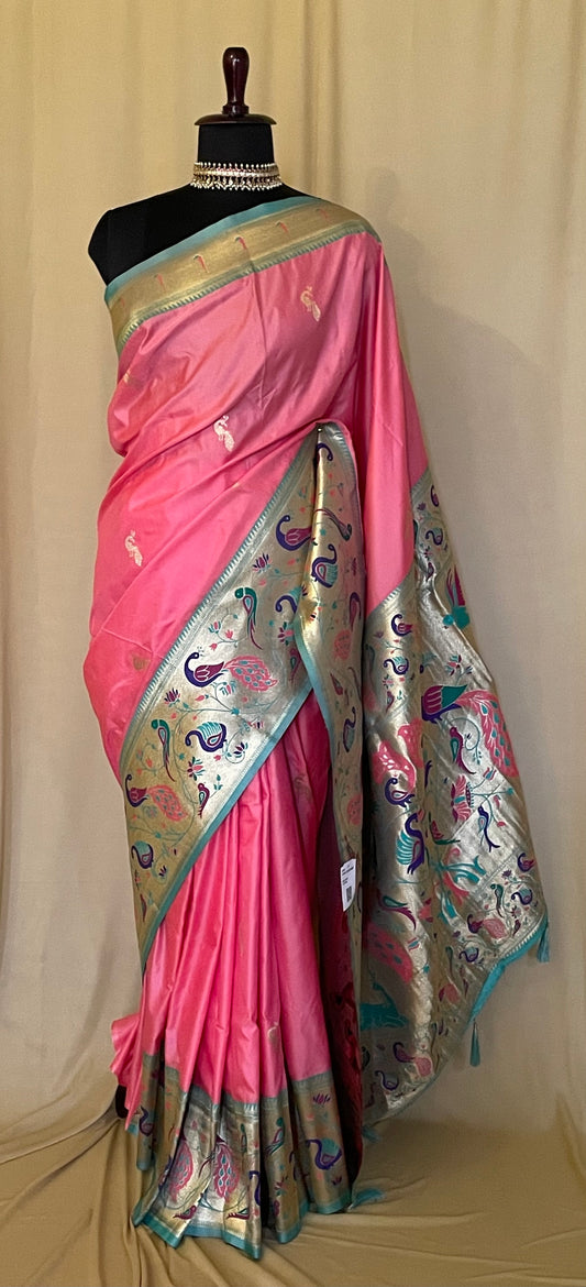 Our Paithani Saree collection showcases one of India's most revered and traditional handloom creations. Paithani sarees are woven with extraordinary craftsmanship, originating from the state of Maharashtra. Known for their luxurious feel and stunning traditional motifs, Paithani sarees often feature intricate zari work and beautiful peacock or floral designs. These sarees are perfect for women who admire heritage and culture, combining timeless beauty with rich history. Wearing a Paithani saree is like wearing a piece of art.