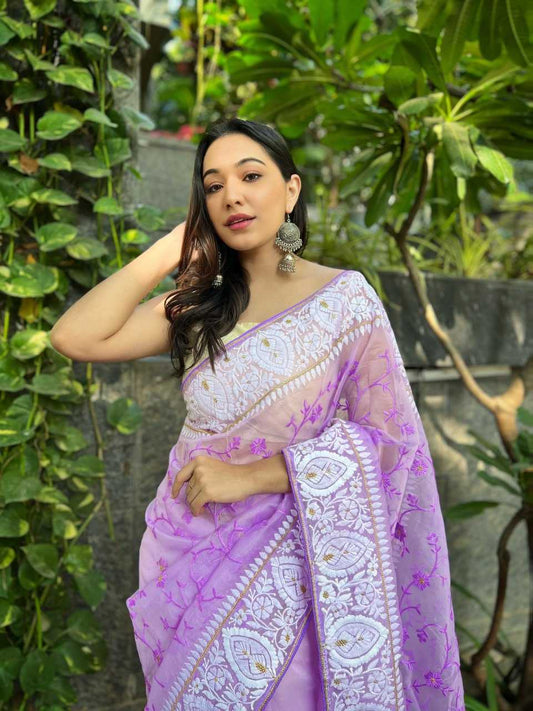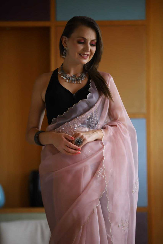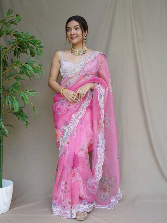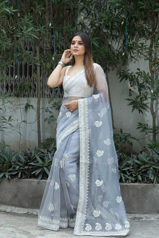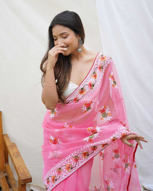 Beautiful Organza Saree with Embroidered Flowers All Over