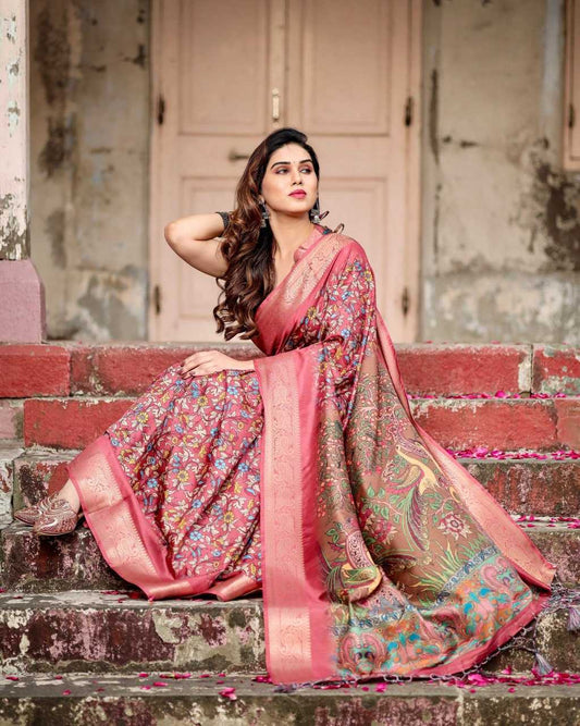Beautiful Pink Pure Silk Saree with Peacock Design