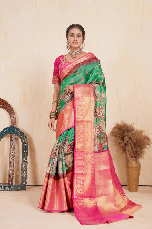 Pattu Kalamkari Silk Saree with Brocade Blouse and Contrast Pallu