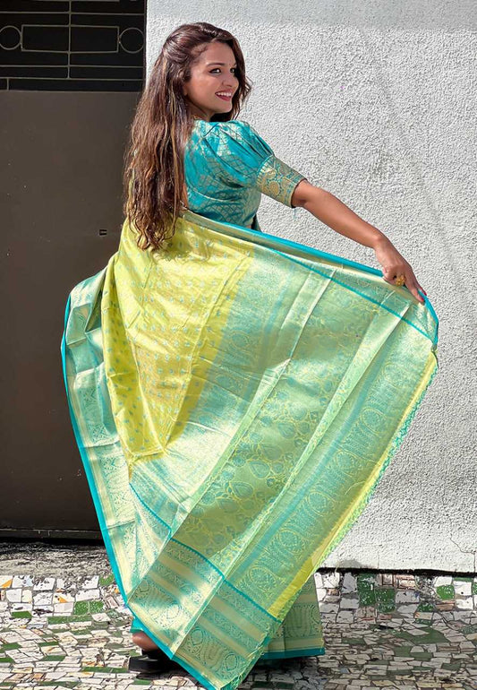 Kanjivaram Tissue Pattu Traditional Saree with zari weaves all over the body